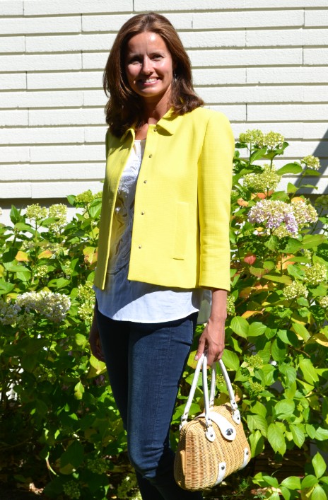 14. Que vous êtes jolie Karine avec cette veste jaune! Cette couleur met en valeur votre teint de sportive et votre sourire a illuminé le Boudoir. Je craque pour votre petit panier si charmant!