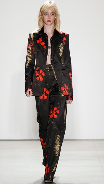 David Bowie époque Ziggy Stardust influence les grandes lignes de sa collection printemps-été 2016. Les smokings flirtent avec les robes de princesse. Jenny Packham ou le Elie Saab anglais signe une partition sophistiquée, sur-caractérisée de strass, paillettes, broderies, dentelles. Du glamour à l’état brut. Le tout Hollywood adore ses  fourreaux de vamps taillés pour les Oscars. Drapés sur la hanche, fentes, flots de mousseline, Kate y trouvera son bonheur.