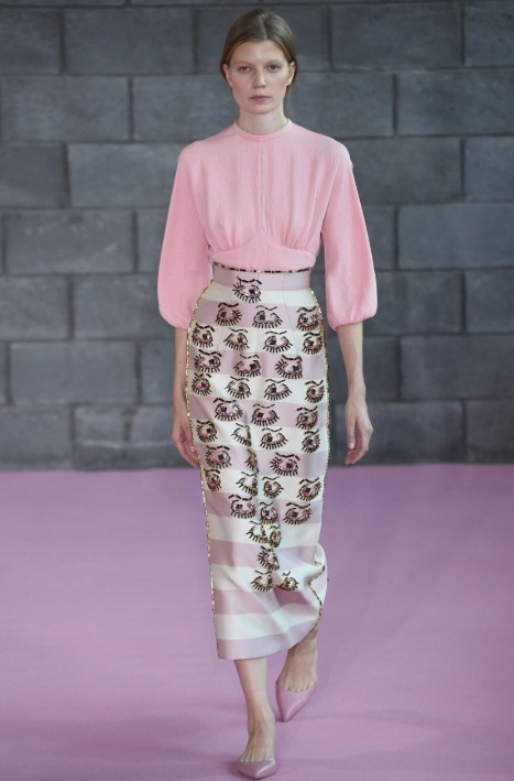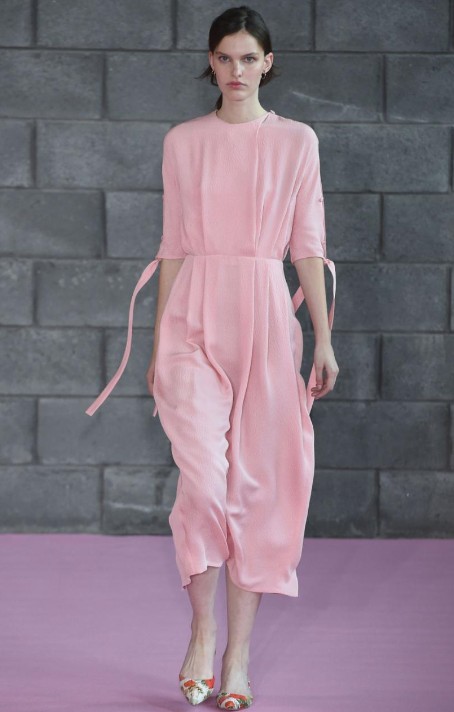 Parpaings gris béton et moquette rose. Le décor est posé. Les tops défilent, le mur des Pink Floyd en arrière-plan. Emilia Wickstead fuit le romantisme de bonbonnière. Ses robes sont coupées dans des étoffes pataudes. Pas de silhouettes arachnéennes, la créatrice néo-Zélandaise ne s’occupe pas des nymphes.