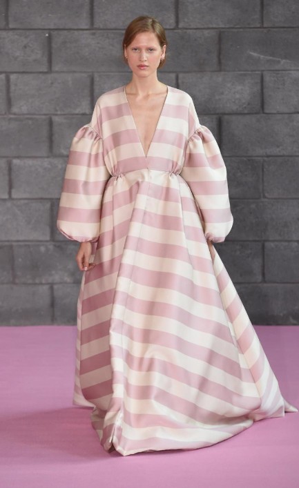 Parti pris pour la longueur mi-mollet, cols surdimensionnés, manteau cape, couleurs poudrés, clashs monochromes, motifs géométriques, rayures bayadères, des fleurs sur les bloomers ou les robes d’apparat à la Zurbaran, une collection engagée, contestataire, pleine de grâce. Sa plus belle.