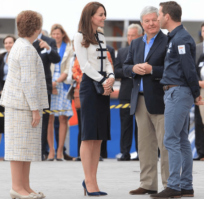 Qu’est-ce qui la ramène à Portsmouth? Le point sur les affaires et le lancement de deux projets phares, sponsorisés par UKSA et la fondation de voile Andrew Simpson. Au cours de sa visite, Kate a rencontré les jeunes challengers à qui ces partenariats vont profiter. Elle a également inauguré le Tech Deck Education Centre. Cet espace flambant neuf, permettra à de nombreux visiteurs, de suivre la construction d’un bateau étape par étape. Kate a profité de ce rendez-vous du jour, pour enrichir ses connaissances en ingénierie. Les élèves inscrits aux ateliers numériques STEMCREW, lui ont enseigné quelques rudiments. La duchesse de Cambridge a gardé le meilleur pour la fin. Après avoir coiffé les écouteurs et fait le tour des installations, elle s’est offert une sortie en mer. Concluons en parlant chiffons. Marinière, imprimé petit bateau, blazer navy, boutons dorés, jupe à pont et couleurs croisière, à Porsmouth Kate hisse toujours les voiles assorties. Kate “on duties”, emporte une tenue de rechange plus confortable. Arrivée en talons, elle a pris congé en slim et baskets.