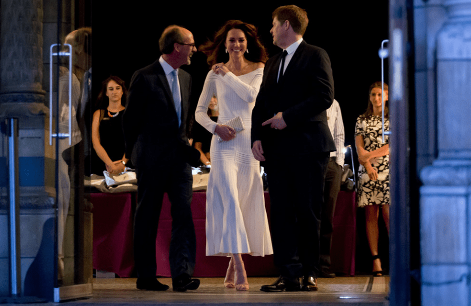 Le Musée d’histoire naturelle reçoit sa marraine royale. La duchesse de Cambridge remet ce soir le prix de l’année (the Art Fund Prize for Museum of the Year). Sa limousine la dépose au pied des marches. C’est une soirée falbalas. La duchesse paraît dans une robe seconde peau, une création de Barbara Casasola, styliste d’origine brésilienne. Encore un vêtement symbolique, clin d’œil aimable de Kate au Brésil, capitale des Jeux Olympiques 2016. Après un festival de chignons, ses cheveux longs reviennent orner ses épaules.