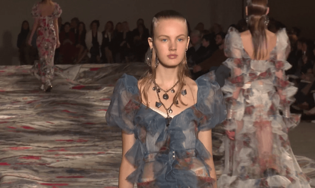 Sarah Burton nous invite dans les îles Shetland. La styliste et ses assistants sont allés respirer le grand air d’Ecosse, terre natale de feu Alexander McQueen, bad boy de la mode britannique. Avant de passer à la pratique, l’équipe s’est documentée dans la nature, réalisant une série de polaroids, observant attentivement la lumière changeante, prélevant des échantillons de mousse, de feuilles et de fleurs, pour mieux retranscrire ces impressions écossaises dans les imprimés de sa collection. Les aventurières à la botte conquérante, revendiquent leurs racines dans des brassières celtiques cloutées, portées sur des robes de bergère, des costumes masculins coupés dans le tartan des kilts, des cuirs et manteaux bucoliques. La talentueuse directrice de création signe une poésie sauvage plus haute-couture que prêt-à-porter.