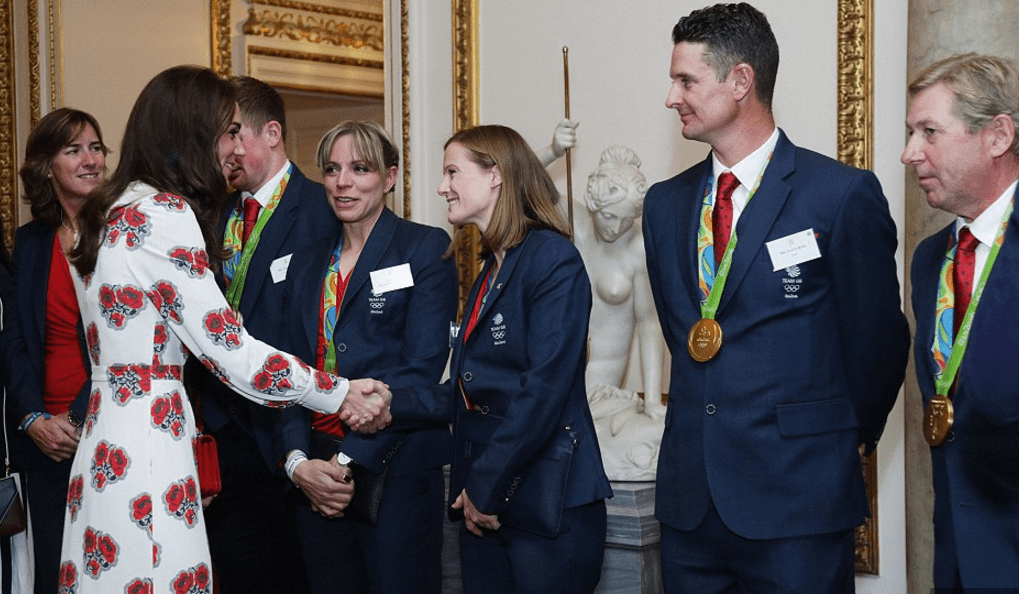 A défaut de les accompagner au Brésil, Kate, William et Harry ont adressé un chaleureux message d’encouragement à la Team GB. C’est la princesse royale Anne, présidente de l’association britannique olympique et membre du comité international olympique, qui a emmené les athlètes vers la victoire, en faisant le voyage jusqu’à Rio. “Cette équipe victorieuse est un modèle de réussite qui va inspirer les générations”, ont déclaré les “Royals”. Dans une robe effet peau de crocodile et d’une main gantée de noir, Elisabeth II félicite les stars de Rio. Le prince Harry, toujours aussi charmeur, gratifie les hockeyeuses d’un “Hello ladies”. Pour cette réception dans les ors du palais, la duchesse de Cambridge a jeté son dévolu sur une robe parsemée de coquelicots patriotiques.