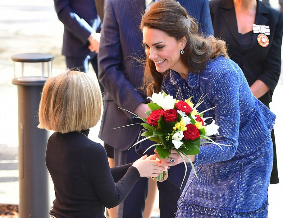 Comme le veut le protocole, la visiteuse royale reçoit un bouquet de fleurs fraîches. Isabelle, huit ans, le lui offre en signe de bienvenue. La duchesse en hume le parfum, et se penche vers la fillette pour la remercier. Son ensemble veste-jupe/veste-robe (?) griffé Rebecca Taylor appartient à ligne “Sparkle Tweed” 2016.