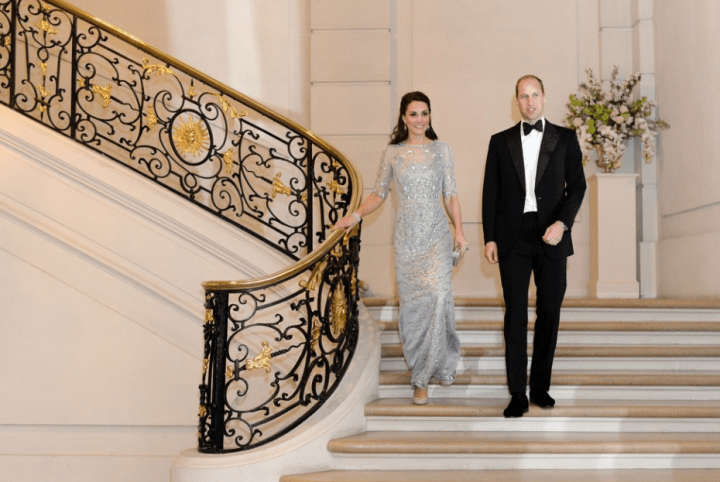 Deuxième apparition glamour au dîner de gala organisé dans un décor féerique: dorures et grand escalier marmoréen. Kate est une étoile. Une robe de sirène Jenny Packham rebrodé de pierreries et des accessoires tombés d’un rayon de lune. Elle prend place à la table d’honneur. La duchesse a pour voisin Jean Reno, une compatriote: la comédienne britannique Kristin Scott Thomas. Que sert-on dans la porcelaine fine? Des crevettes de la baie de Dublin, des écrevisses, des pommes de terre rôties au thym et un soufflé glacé au chocolat blanc et noir, accompagné d’une sauce au caramel. Le couple princier s’endort dans les lambris de l’hôtel Bétune-Charost.