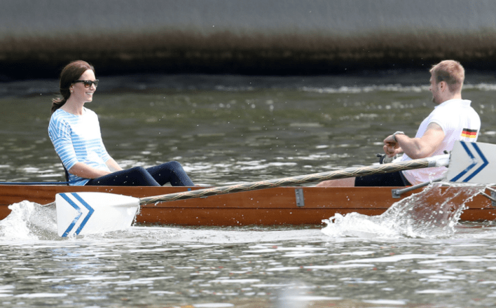 Connaissant leur potentiel sportif, les organisateurs de la tournée Brexit les ont inscrit à un entraînement d’aviron sur le Neckar, l’affluent du Rhin. Kate valide, enchantée de remettre la panoplie casual. La médaillée a bien mérité une double rasade de bière servie dans un bock.