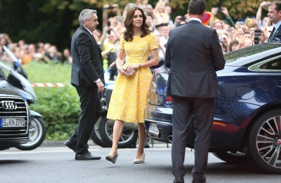 Je trouve la robe jaune plutôt jolie et lumineuse sur la duchesse mais la silhouette est ratatinée par cette paire de compensées, vous m’excuserez mais il n’y a pas de mot pour dire à quel point ces souliers sont moches. Qui peut préférer ces chaussures antidatées à une paire de ballerines élégantes?