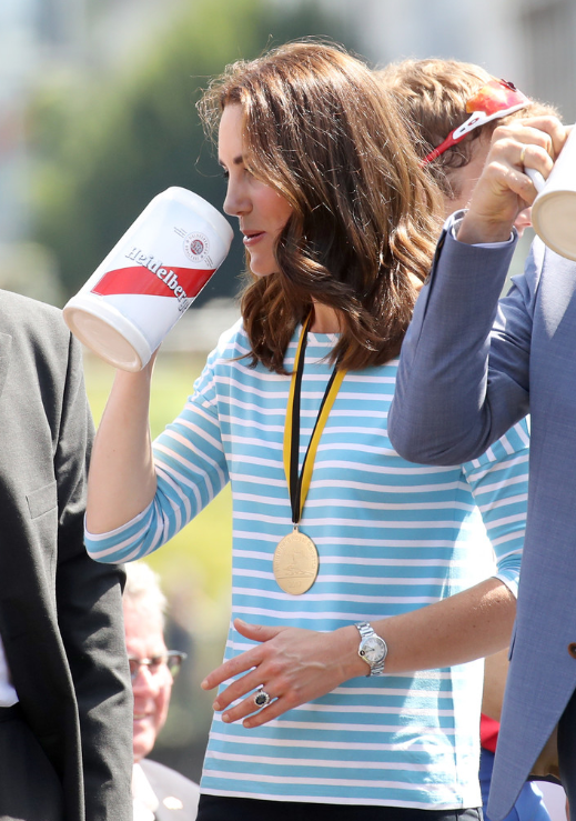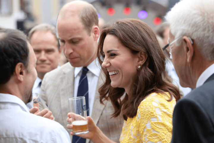 Les obligations du jour débutent par une visite au centre de lutte contre le cancer. Par-dessus sa robe solaire, allusion au drapeau germanique-il ne manque plus que le noir à évoquer-Kate enfile la blouse blanche des chercheurs et détaille une cellule au microscope. A quelques kilomètres de là, les admirateurs se massent du côté de la place du marché. Ils ne veulent rien perdre de cette visite royale.  A son arrivée, Kate salue ses fans et n’oublient pas de remercier aussi ceux qui observent le spectacle depuis les balcons décorés de jardinières. Les Royals n’échappent pas aux animations de rues. Au programme du jour, une démonstration sur l’art de rouler les bretzels. William se débrouille comme un chef! Vin blanc, liqueur, champagne, les breuvages varient. Aujourd’hui la bière mousseuse est à l’honneur.