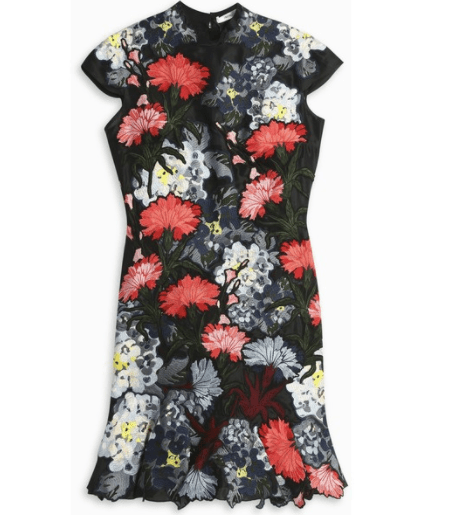 La forme de sa robe est parfaite, surtout l’encolure, les coloris sont très printaniers et pimpants mais les broderies un peu trop voyantes à mon goût… Ravissante coiffure également !