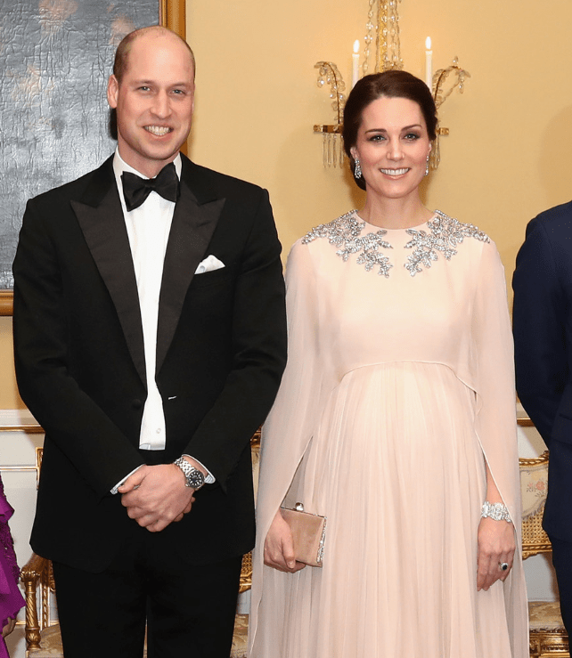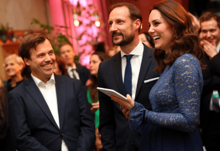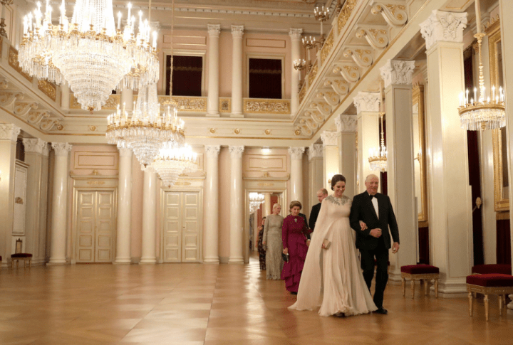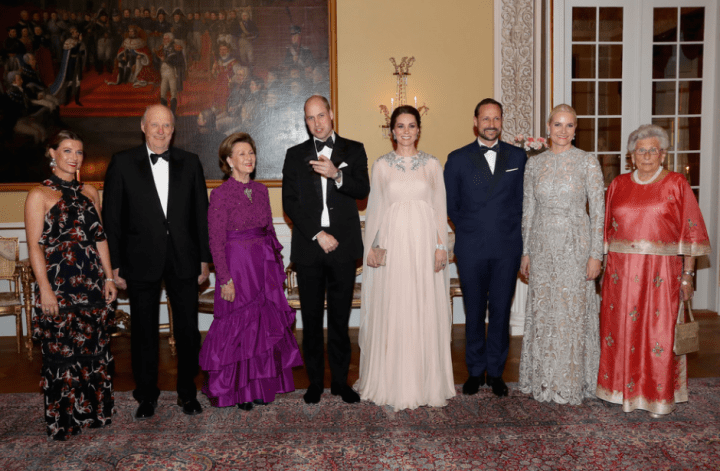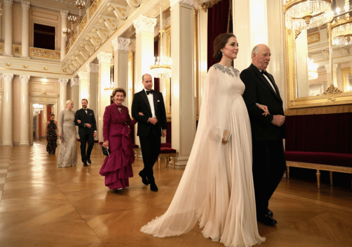 Leurs altesses royales visitent ensuite le MESH, un espace de travail consacré aux starts-up. Le roi de Norvège donne un dîner en l’honneur du couple Cambridge. Une consolation pour les fans des fameux “moments tiares”. On espère du glamour, une robe de princesse, un chignon et des parures. Le public est choyé. Harald V sert de chevalier servant à l’épouse du prince d’Angleterre. La procession traverse les interminables salles d’apparat. Une duchesse descendue de l’Olympe, ouvre la marche dans une robe-cape Alexander McQueen, le couturier des grands jours. On dirait une jeune première que l’on conduit au bal des débutantes. La toilette en mousseline blush rebrodée d’argent lui donne l’aura d’une reine. La pochette assortie est nuance ballet rose. Le souverain, ami de longue date des Windsor, prend la parole. Il appelle la duchesse par son surnom. Il prononce Kate et non Catherine. Dans son discours, Harald V dit admirer la façon dont le couple princier accomplit son devoir et seconde la reine Elisabeth.