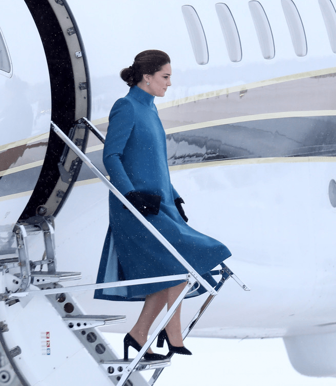 Le jet se pose dans un décor enchanteur. Le grand blanc. La neige recouvre le paysage. William part devant saluer le comité d’accueil. Kate descend les marches de la passerelle, en se tenant prudemment à la rampe. La neige crisse sous ses semelles. Le beau monde se bise affectueusement sous les flocons.