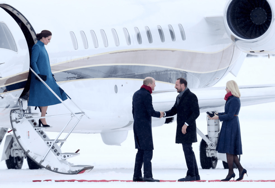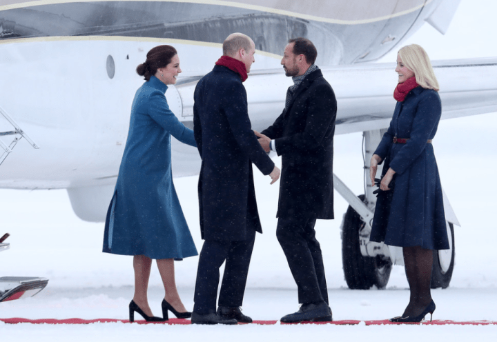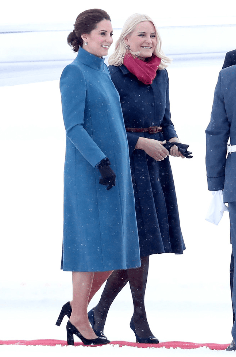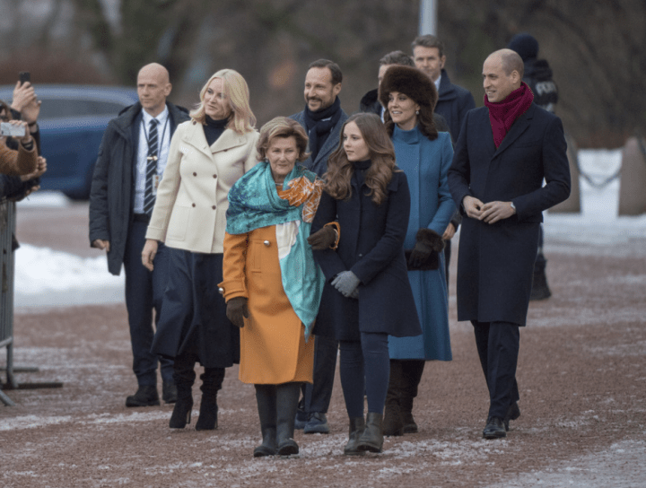 La duchesse de Cambridge et la princesse de Norvège portent deux nuances de bleu, une des couleurs du drapeau. Le manteau à col cheminée a été coupé sur mesure par les ateliers Catherine Walker, la maison de couture attitrée de la princesse de Galles. Une flotte de limousines convoie les passagers au palais. Les familles royales respectives échangent les cadeaux. Les visiteurs remettent un portrait dédicacé William et Catherine au couple souverain. Dans les jardins de la princesse Ingrid Alexandra, les norvégiens guettent la sortie de groupe. Il ne manque plus que le traîneau de Jivago. Tsarine Kate remet les accessoires à la russe au goût du jour. Une sympathisante les interpelle en leur disant qu’elle a cinquante ans aujourd’hui. Et la duchesse de remarquer que sa mère a fêté son anniversaire sans elle.
