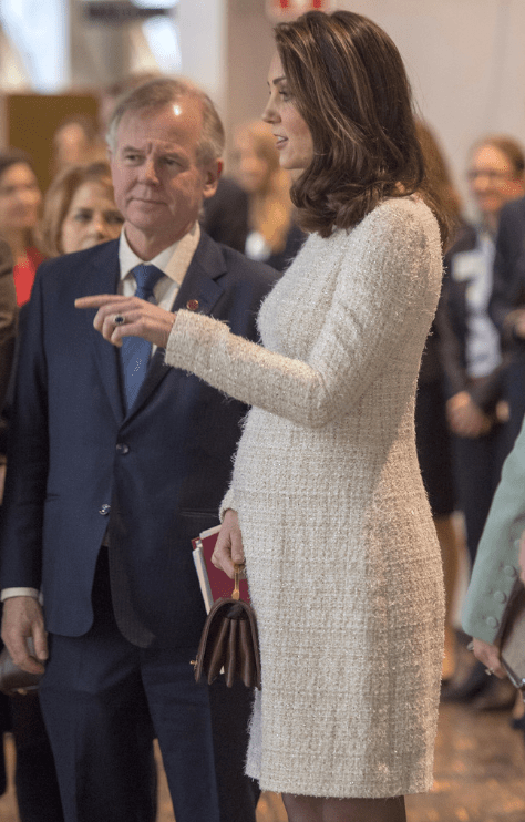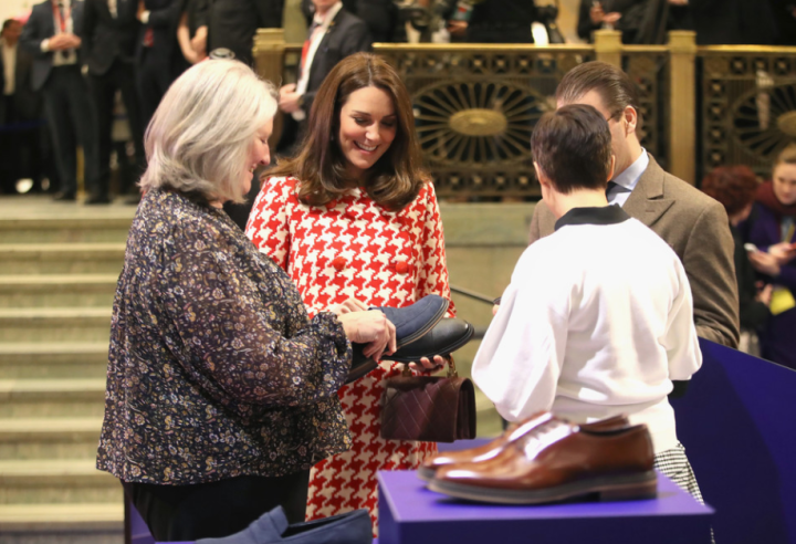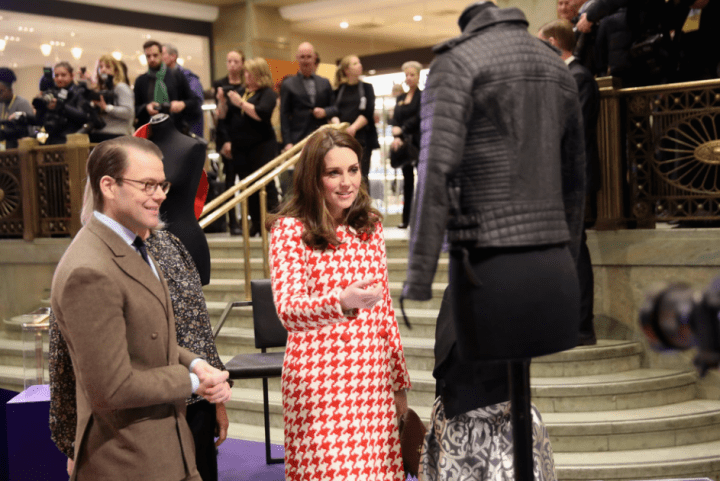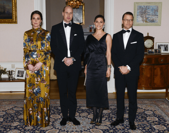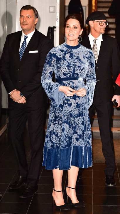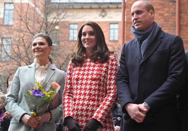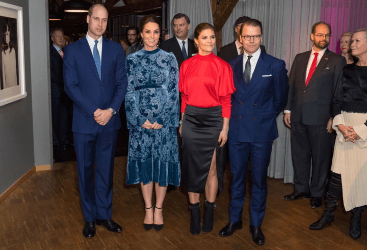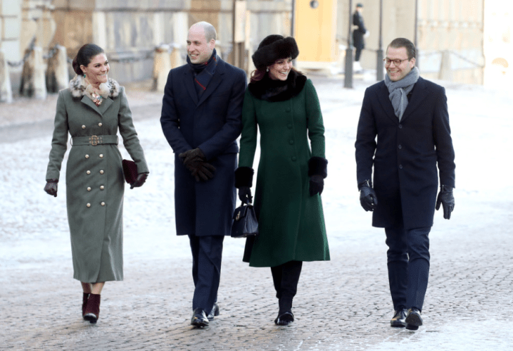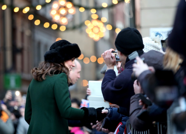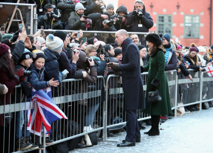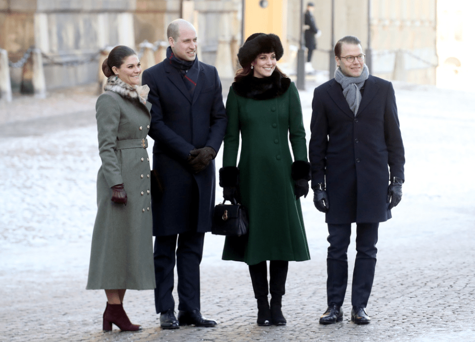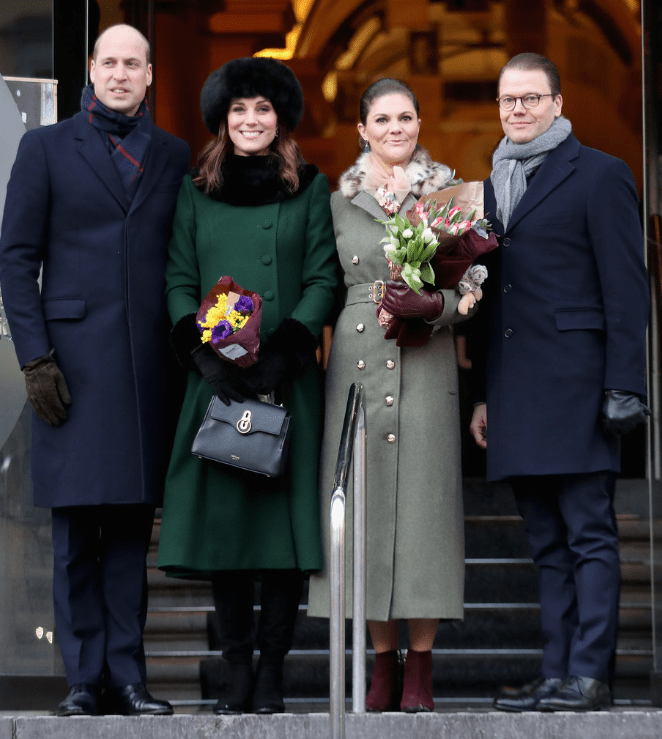 Le quatuor entame une marche jusqu’au musée Nobel. Les deux jeunes femmes jouent la partition des longs manteaux verts. La duchesse personnalise le sien d’un col et de manchettes en fausse fourrure. Les suédois rassemblés au square Stortorget les acclament. Les Cambridge prennent leur premier bain de foule. Les drapeaux des deux nations battent la mesure. Ni vu ni connu, Mrs Cambridge change de chaussures. Le sac en bandoulière n’est pas recommandé par la liste royale. La duchesse commande un modèle porté main chez Mulberry et remet son Chanel.
