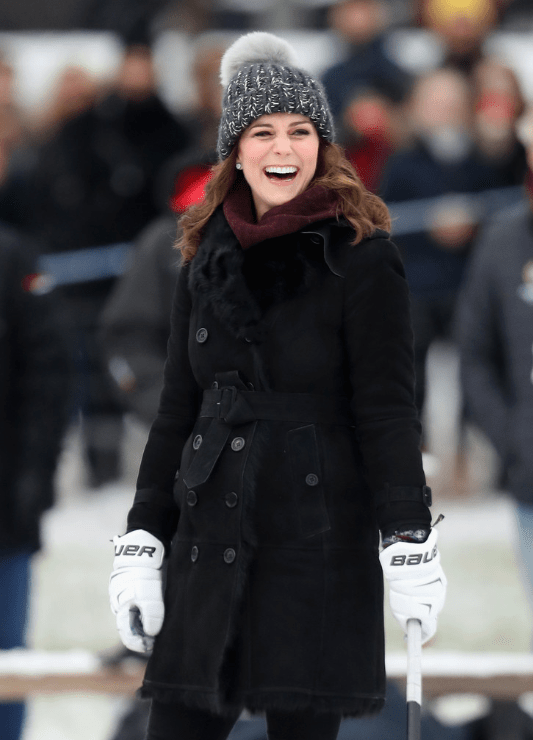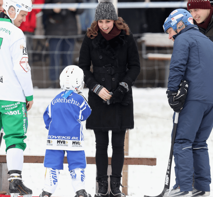 Ni tambours ni trompettes. Le couple Cambridge fait ses débuts à la patinoire Vasaparken. L’ancienne hockeyeuse sur gazon ne pouvait rêver mieux comme entrée en matière. Le bandy-hockey, originaire du Cambridgeshire, est devenu le plus populaire des sports d’hiver suédois. La scène se passe en plein air sous une température de -1°. On sert des biscuits et un succédané de vin chaud-le Glögg- à la future mère. Kate reste chic sous toutes latitudes et températures. Elle s’est bien équipée: un bonnet de ski, une peau lainée, des gants isolants et des moon boots Sorel que les fashionistas portent à la ville. On encense son swing mais elle s’incline face à William.