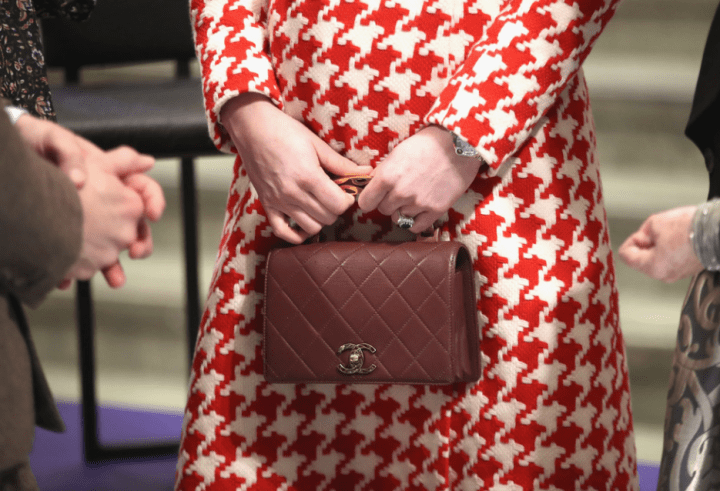 Son manteau en pied de poule est super joli bien que je ne pense que j’oserai le mettre, son petit sac est distingué et ça nous change des minaudières !