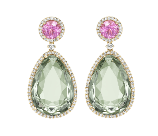 7. J’adore ces boucles d’oreilles ! Probablement des améthystes vertes et mauves montées sur or jaune, un choix de couleurs très raffiné qui met en valeur le teint et les pupilles de notre duchesse.