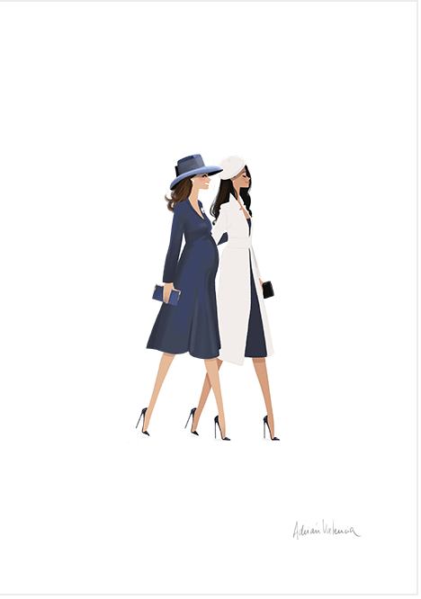 Les photos de Kate et Meghan chapeautées ont fait le tour du monde. L’illustrateur argentin Adrian Valencia a croqué l’arrivée des élégantes à l’abbaye de Westminster, le jour de la cérémonie du Commonwealth. Les silhouettes élancées et racées des reines du Gotha rappellent celles de Kiraz, le célèbre illustrateur des pages de Jours de France. Il est vrai que dans leurs manteaux ajustés, la duchesse et sa future belle-sœur avaient fière allure. Le dessin et le mug sont vendus sur le site de l’artiste.