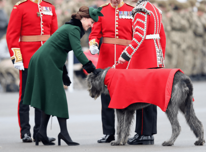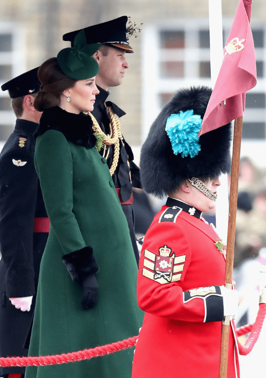 Dès leur arrivée, les représentants de la couronne se partagent la tâche. Ils connaissent le déroulement de la cérémonie sur le bout des doigts. Le colonel du 1er Bataillon des Irish Guards passe les troupes en revue. La tradition veut que des mains féminines remettent le trèfle aux soldats. La duchesse leur en offre un brin, et en glisse un dans le collier du lévrier irlandais Domhnall, la mascotte du régiment; une vieille connaissance qu’elle gratifie d’une caresse.