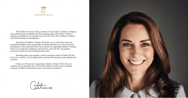 A l’occasion du lancement de la semaine des enfants malades et des soins palliatifs, la marraine de EACH a adressé une lettre à l’oeuvre qu’elle parraine. Le thème de la campagne de sensibilisation est celui de la brièveté de l’existence. Dans le cadre de son action caritative, la bonne fée royale a rencontré beaucoup d’enfants gravement malades et de familles éplorées. Elle en a tiré une philosophie qui consiste à profiter du temps court et précieux qui nous est imparti pour se faire des souvenirs. Dans son témoignage de soutien, elle se dit comblée par les  activités de plein air en compagnie des bambins: “passer du bon temps ensemble est un aspect si important de la vie de famille, et pour moi, en tant que mère, ce sont les moments simples comme jouer dehors que je chéris”. On se souvient des scènes craquantes, de Kate et George  crapahutant dans l’herbe et des éclats de rire. Mrs Cambridge mène la vie de château mais  trouve son bonheur dans les joies simples de la vie.