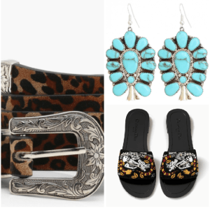 Je prends volontiers la blouse a trous-trous et les pendants d oreille turquoise.