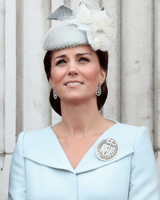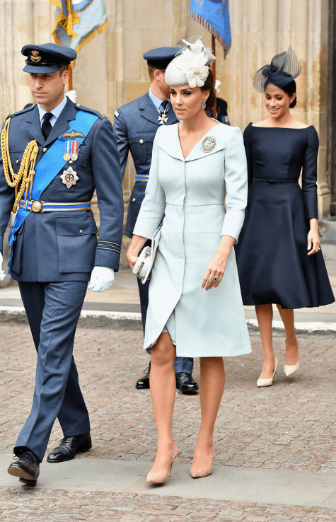 Le bleu est la couleur de mise. Sur le revers de sa robe manteau bleu glacier Alexander McQueeen, le commandant honoraire a épinglé l’insigne de l’institution héritée du prince Philip en 2015. Quand elle aime, l’épouse du prince William commande le même modèle dans plusieurs tonalités. La toilette reprend les lignes de celles du baptême de Charlotte et du mariage de Meghan. Le chapeau est l’oeuvre de Sean Barrett, le chapelier attitré de la série Downton Abbey & The Crown.