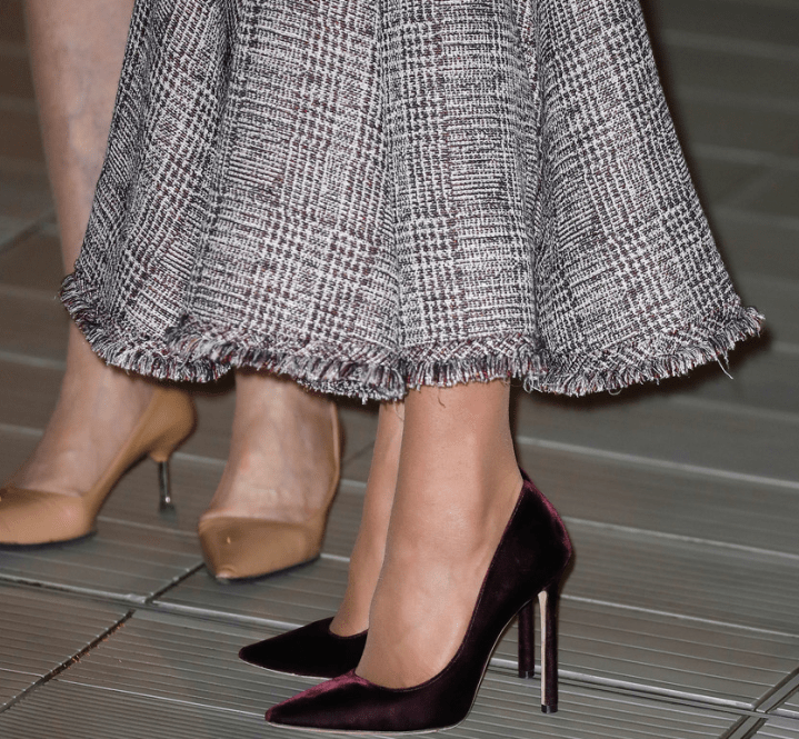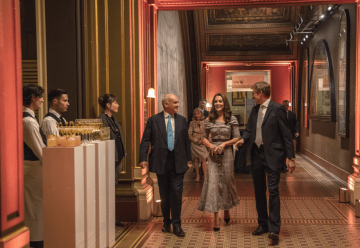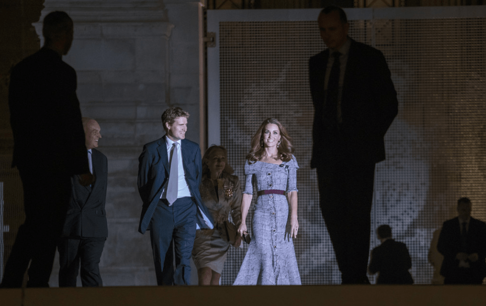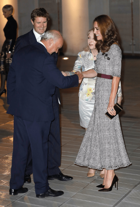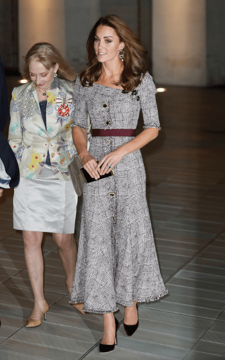 Les passants se regroupent aux abords du musée. Ils guettent le cortège. La visiteuse fait son entrée à la nuit tombée. Resplendissante duchesse. Sa robe Prince de Galles effrangée, animée de boutons précieux gante sa silhouette sculpturale. Le vêtement a été livré au palais de Kensington, moyennant quelques ajustements: un membre de la maison de Windsor ne montre pas son ventre. Erdem Moralioglu a dessiné ce modèle (collection été 2018) en s’inspirant des toilettes de la reine Elisabeth. Le décolleté rétro rappelle celui de la Jesire, portée au vernissage Lucian Freud. Catherine rajoute sa touche personnelle. Une ceinture et des accessoires déclinés dans les tons de cassis.