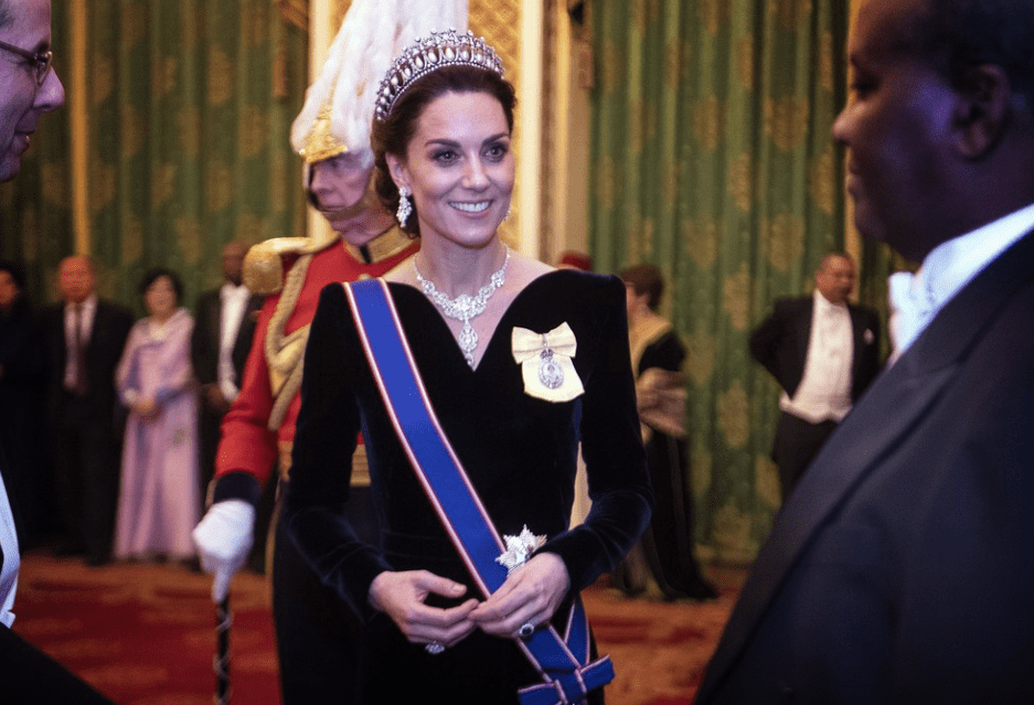 4. Duchesse Catherine suit en beauté, élégance et discrétion son petit bonhomme de chemin d’apprentissage de future reine. Tiare en tête, elle tombe dans la cassette de bijoux de la reine et, entres autres babioles en perles, rubis et émeraudes, émerge avec ce magnifique collier au cou.