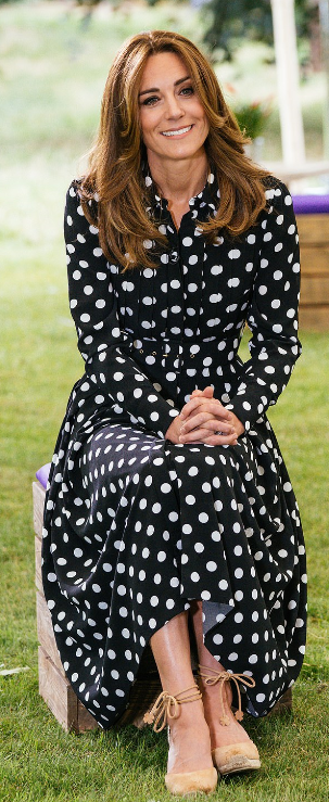 “J’aurais aimé pouvoir bénéficier de ce genre d’informations à la naissance de George”, confie la duchesse de Cambridge à l’intervieweuse, lors d’un entretien télévisé filmé la semaine dernière. L’invitée présente Tiny Happy People, le site gratuit de la BBC Education destiné aux heureux parents. Ce dernier offre aux intéressés un bouquet numérique sur le langage des premiers stades de la vie. Il a été pensé de concert avec la fondation philanthropique désormais chapeautée par le prince William et son épouse. Un film d’animation auquel HRH a prêté sa collaboration est relayé dans la foulée. Rencontre sur l’herbe et mesures barrières. La mère de trois enfants, experte en matière d’éveil et d’éducation-elle a fait la classe et occupé les siens pendant le confirment-partage son expérience avec des familles assises sur l’herbe. Coiffeuse et coloriste ont déconfiné la royale chevelure abonnée au brushing maison et coiffures qui dépannent. Un semblant de frange se dessine, des mèches miel illuminent le châtain noisette. Le look se compose d’une robe chemisier à gros pois dont on a retouché les manches et d’espadrilles à talons compensées. Le duo signe le fameux style-Kate. Sur la Toile britannique les internautes applaudissent la future reine à la coiffure waouh.