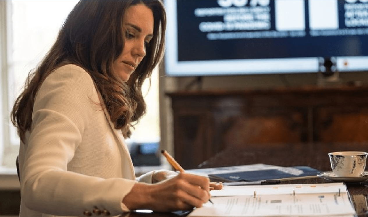 Une tasse de porcelaine posée sur un coin de bureau, Kate très concentrée prend des notes. Côté mode c’est Byzance! L’icône royale change de tenues à chaque fois. Deux blazers taillés pour les décideuses renforcent le sérieux de l’affaire. L’ancienne robe Trina, fidèle compagne de route, est remise au goût du jour matinée d’une médaille. Un pull et une parka complètent le dress code. Le Palais donne un écho généreux au travail de son altesse royale. Cinq spots illustrant les 5 Grandes Questions sont relayés sur le compte princier. Une dernière vidéo referme le bal. Un téléphone en main, la duchesse de Cambridge traite quelques demandes en évoquant son quotidien de maman (les conseils d’experts ne seraient pas de refus), son enfance et ces heures passées à jouer dehors. Un rose à lèvres plus soutenu s’accorde à la tonalité de sa blouse lavallière lilas. Si les circonstances le permettaient, la reine déposerait un baiser reconnaissant sur ses joues. Well done, Catherine.