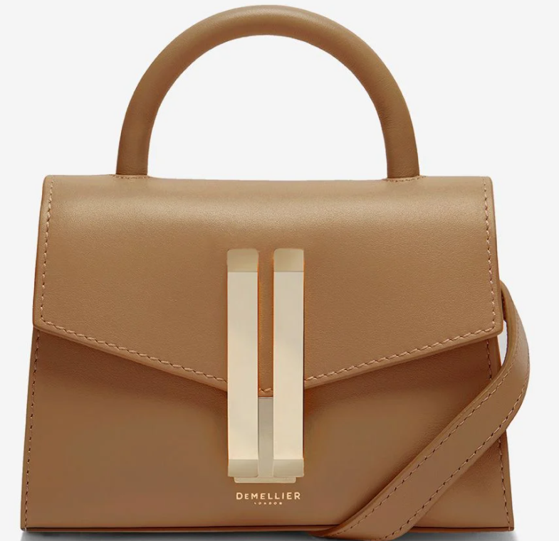 L’icone de la cour étrenne un manteau long en crêpe de laine accessoirisé d’un sac porté main, couleur toffee, acheté chez Demellier, enseigne de maroquinerie popularisée par la duchesse de Sussex.