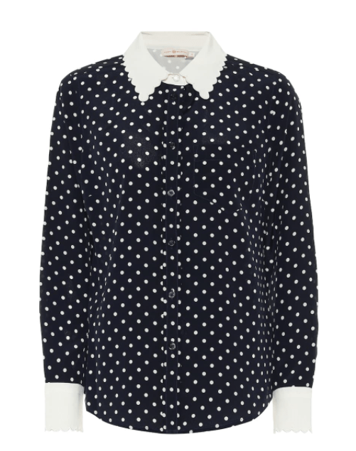 Revenons aux classiques de l’icône de la cour. Le pardessus marine Catherine Walker nous prouve que la duchesse a une importante collection de manteaux longs dans ses armoires. Elle a fait sien le duo blouse et pantalon. Avis aux amatrices, les pois sont de retour.