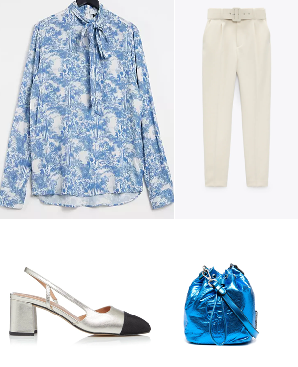Blouse lavallière Asos Design 34.99€, pantalon Zara 39.95€, slingback Dune London (La Redoute) 60€, sac métallisé K.Lagerfeld 175€
