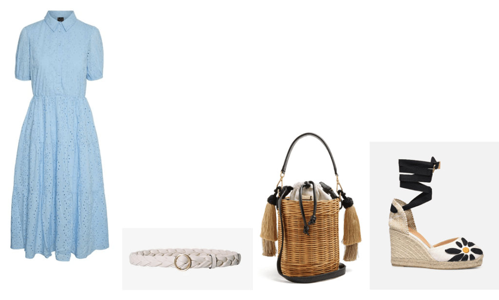 Robe broderie anglaise Vero Moda (La Redoute) 64.66€, ceinture tressée Next (La Redoute) 17€, sac seau rotin Wai Wai 405€, espadrilles Castaner 135.00€
