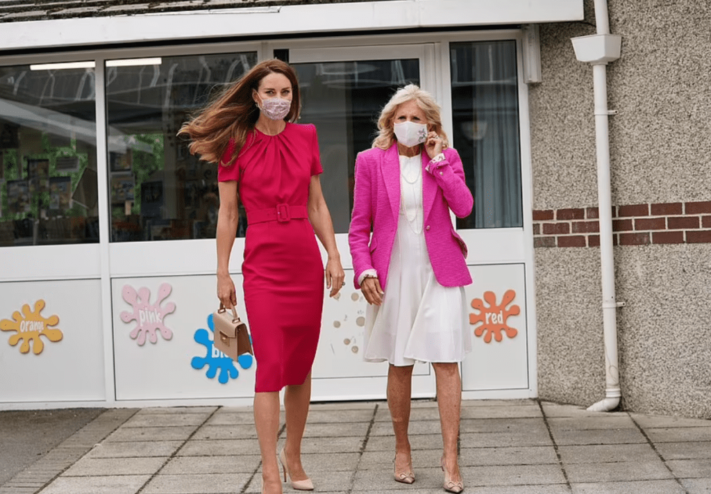 Pendant que les négociations se poursuivent à Carbis Bay (gestion pandémique, financement de la lutte contre le réchauffement climatique, taxation numérique), la princesse du Royaume-Uni et Mrs Jill Biden se rencontrent en Cornouailles. Les présentations sont faites sous les flashs et le ciel gris. Une journaliste de la NBC demande à la duchesse si elle a vu sa petite nièce sur Facetime. “Je leur souhaite le meilleur et j’espère la rencontrer très vite”, lui répond l’intéressée. La représentante de la Firme sert de guide à la First Lady. La visite de l’école primaire locale fait écho au travail de la princesse des enfants. L’épouse du président Biden met les écoliers à l’aise en leur montrant une photo de la Maison Blanche, sa résidence officielle. Sur le ton de la conversation, Kate tisse une belle amitié qui se verra probablement consacrée par un voyage aux States. Chacune exprime sa conception de l’élégance: les deux grâces voient la vie en rose. Mrs Biden porte un blazer fuschia, Mrs Cambridge une robe crayon rose dahlia, du couturier des grands jours.