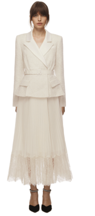 Par contre, et c’est seulement mon avis, cette tenue comporte pour moi trop d’éléments. Trop de matières et de formes différentes. Rien que dans la jupe j’en perçois au moins deux ainsi que deux longueurs différentes. Les plis sur le devant semblent se distinguer des autres.