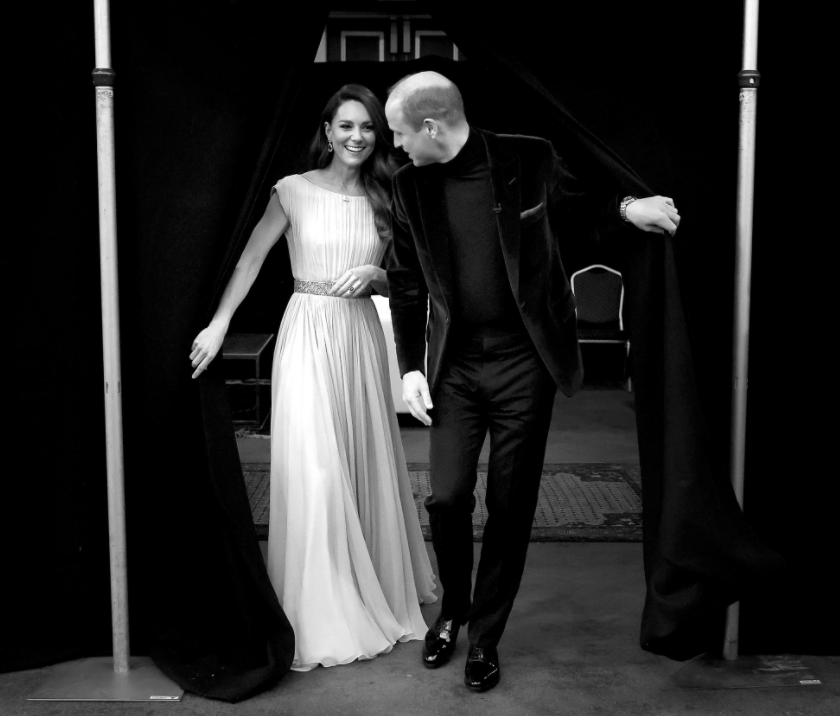 Contrairement aux autres commentaires, je n’aime pas du tout la tenue de William. J’ai beaucoup de mal avec les costumes en velours qui font vieillots (mon prof d’économie et son costume en velours vert bouteille tout râpé y est sûrement pour quelque chose) et il n’est pas assorti à Kate. On croirait qu’il va boire un verre de whisky auprès du feu dans son club de gentlemen, pas à une soirée de remise de prix.