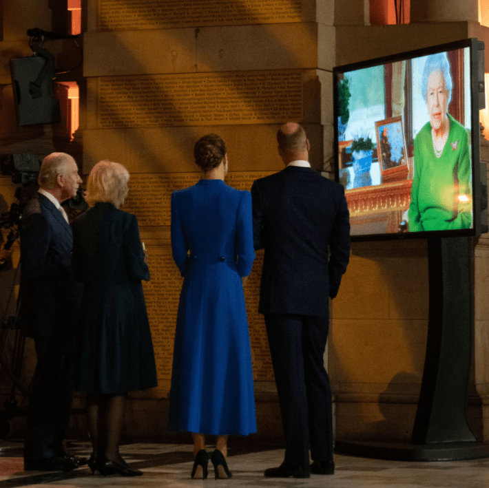 Le monde entier aura les yeux fixés sur l’Angleterre”, proclame la reine devant le Parlement écossais. Elle n’imagine pas que sur avis médical, elle devra renoncer au sommet. Assignée à résidence sur recommandation de ses médecins, Sa Majesté délivre le message virtuel, appelle à l’unité et à l’action. Filmée à Windsor, elle est vêtue d’une robe verte dans le ton de l’événement. La broche papillon est un écho au portrait de son bien-aimé immortalisé au milieu d’une nuée de lépidoptères.