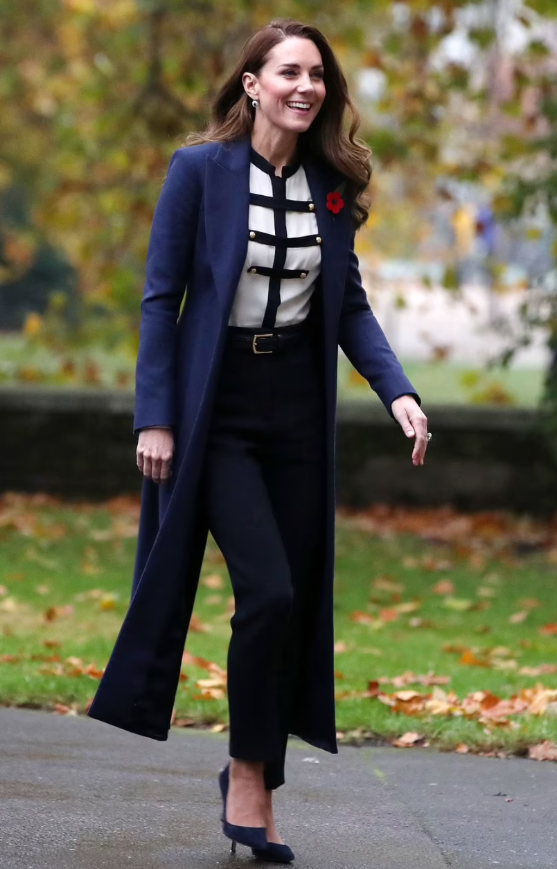 La tenue du jour cultive l’allure militaire. Elle décline deux nuances de sa couleur préférée. Pantalon et manteau long ont ses faveurs. La blouse à applications effet brandebourgs portée en 2011, lors des émeutes de Birmingham, fait son come-back. Boucles d’oreilles et bague de fiançailles en saphirs et diamants jouent la note bleue.