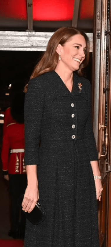 Comme d’habitude, Kate fait une entrée très photographiée. Les bijoux de Lady Diana agrémentent une robe en tweed déjà connue du public. L’icône de mode éblouira la Toile le 18 novembre (Royal Variety Performance) : l’evening gown est de mise et on connaît son goût pour ce qui brille.