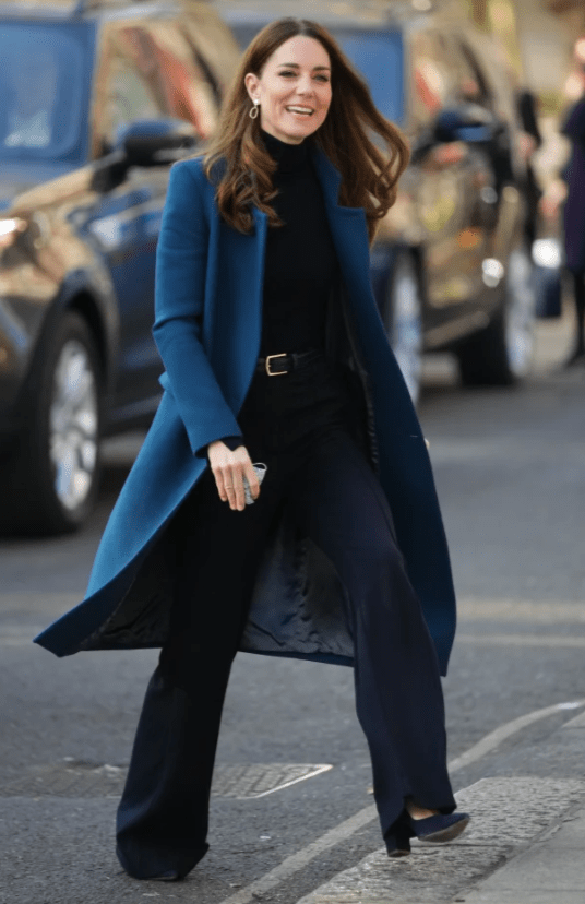 En 2022, Kate réaffirme sa préférence pour le pantalon et nous donne une leçon de chic à l’anglaise. A son pardessus bleu remis au goût du jour, elle associe des boucles d’oreilles fantaisie, vendues £7 chez Accessorize, le leader britannique de l’accessoire low cost.