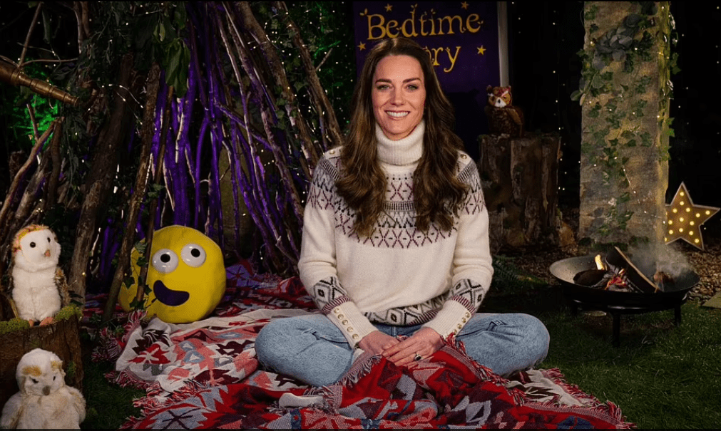 Installée dans un décor onirique peuplé de peluches et de bougies, Kate, assise en tailleur sur un plaid coloré, raconte l’histoire de “La chouette qui avait peur du noir” de Jill Tomlinson. La mère de famille a sans doute elle aussi feuilleté cet ouvrage paru en 1968 pour aider George, Charlotte et Louis a trouver le sommeil.