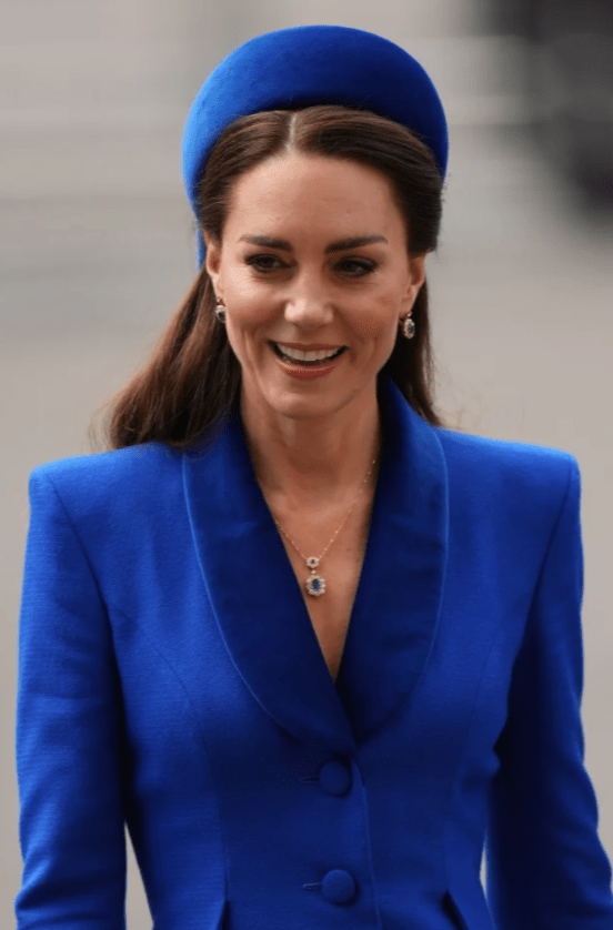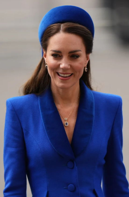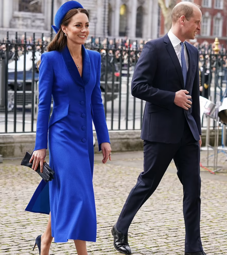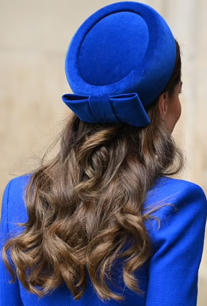 Comme la plupart d’entre vous, je n’aime pas particulièrement la tenue de Kate, en effet toujours la même depuis quelque temps. Silhouette filiforme, manteau trop long, trop longiligne, comme un jour sans fin ! Que n’a-t-elle gardé le col à pointes triangulaires du manteau à l’origine (vu sur un autre site), ce qui lui donnait davantage de rythme et d’épaisseur. Pour les obsèques du Prince Philip, elle portait un tel manteau avec des escarpins aussi haut perchés, et Lynda, vous l’aviez comparée alors à un …cierge ! Cette fois le “cierge” est d’un beau bleu lumineux, que certains ont vu comme un soutien à l’Ukraine…