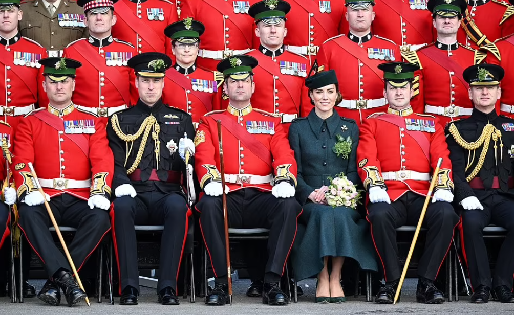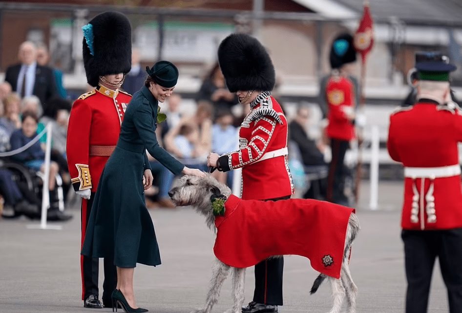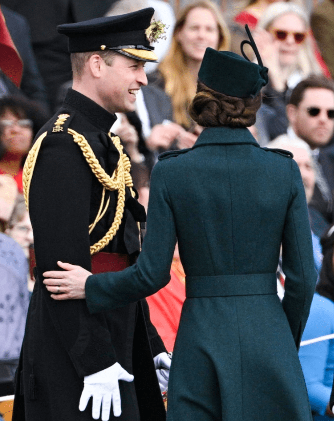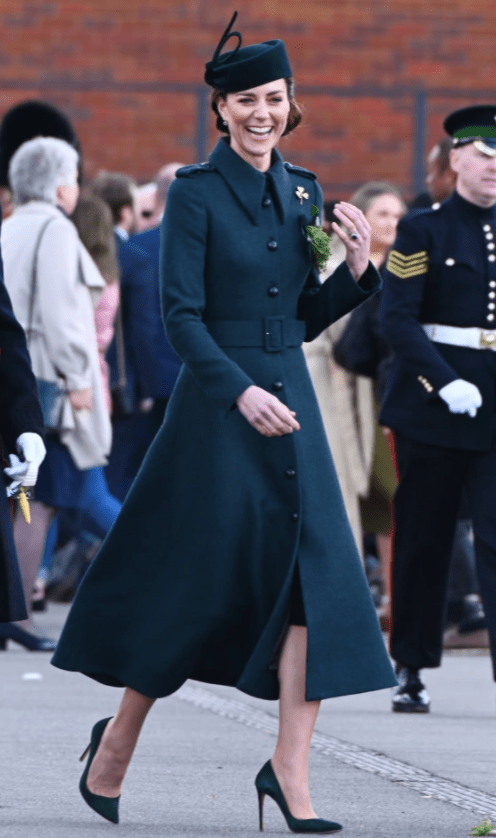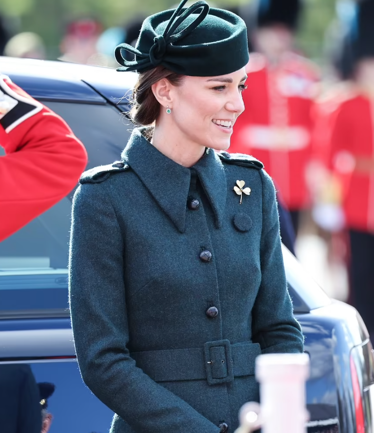 Après deux ans d’empêchement dû à la crise sanitaire, le prince William et son épouse célèbrent le saint patron de l’Irlande. Les royaux connaissent la partition sur le bout des doigts. Le colonel honoraire du premier bataillon des gardes irlandais et la duchesse se partagent les tâches. Monsieur, en grand uniforme et médailles (Kate le trouve irrésistible dans son habit d’officier) passe les troupes en revue, pendant que madame reçoit la corbeille de trèfles. Les militaires et la mascotte du régiment se voient remettre les brins symboliques. Le look de Kate reste dans le ton. Sur son manteau à l’allure martiale, elle a agrafé la broche en or à trois feuilles.