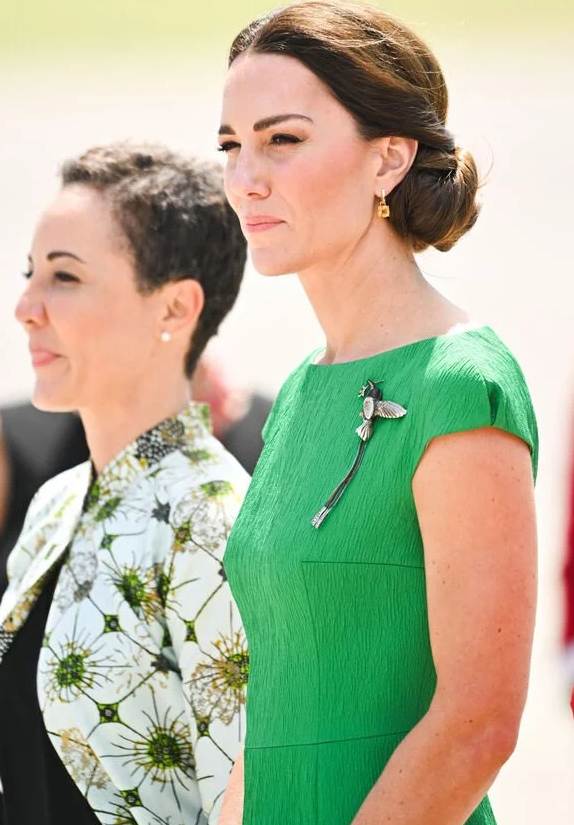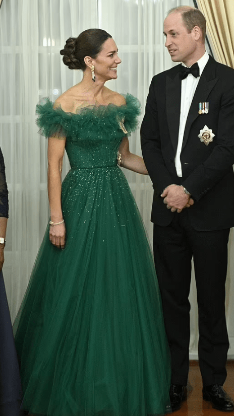Elizabeth II est bonne prêteuse. Elle met à la disposition de sa très chère Catherine une parure émeraudes et diamants ainsi que la broche colibri. Un bracelet triple rangs évoque le souvenir de Diana. Côté coiffure, la princesse aux cheveux longs opte pour un brushing baguette. L’influenceuse en titre, réserve une surprise de taille à ses admiratrices. Elle introduit des pièces rétro datant des années 50, 60, ainsi qu’une saharienne dessinée par Yves le Magnifique. Pourvu que ça dure ! Le prince William se met au diapason. Il porte plusieurs costumes coupés à Savile Row, dits de diplomatie du vestiaire, dont un sublime smoking en velours saphir à la réception du gouverneur général des Bahamas, Sir Cornelius Smith.