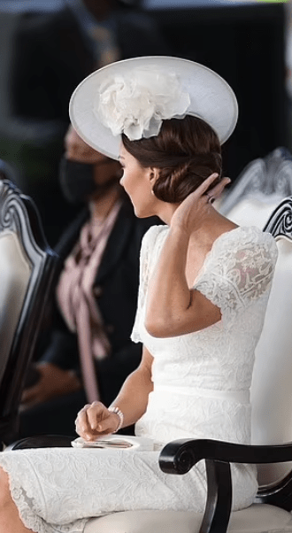 Pour ce voyage, je retrouve un peu le style de la princesse Mary de Danemark qui me plait bcp d’ailleurs. Kate ose un peu et sort de ses classiques ….coupes habituelles. J’ai bcp le semblant de raie sur ses cheveux quant ils sont attachés, le changement d’accessoires, le tailleur blanc lui va très bien et lui procure bcp de fraicheur!