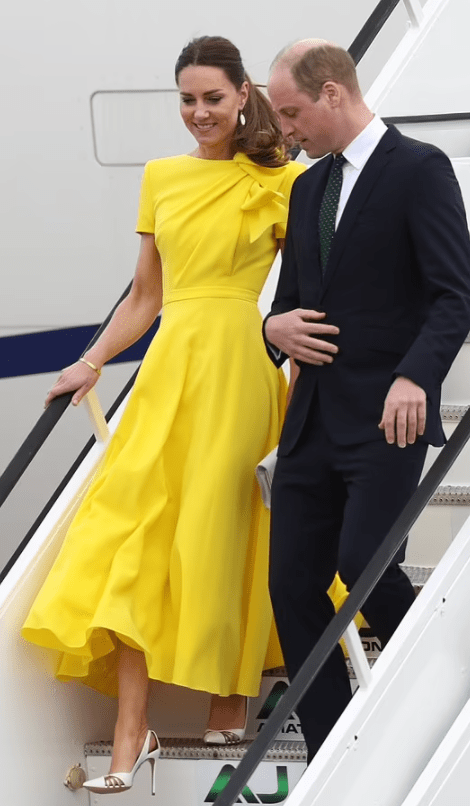 Dès l’ouverture de la porte, le soleil inonde la cabine. Les housses et valises frappées d’un “C” (Catherine) intriguent. Que portera-t-elle ? La tiare sera-t-elle de la partie ? sont autant de questions restant en suspens, jusqu’à ce que Mrs Cambridge dévoile les secrets bien gardés de sa garde-robe. Jenny Packham, Emilia Wickstead, Alexander McQueen, couturiers attitrés aux défilés royaux, donnés aux quatre coins du Commonwealth, sont de la fête. Le vestiaire établit de subtiles correspondances entre le ton des étendards et celui des toilettes. Se présentent sur le tarmac un ensemble bleu, une robe jaune concentrant à elle seule, toute la lumière des tournesols de Van Gogh, une verte en quittant la Jamaïque, une autre déclinaison de bleu vert aux Bahamas et celle des adieux, très inspirée des années 80 époque Dynastie, hissant une dernière fois les couleurs nationales.