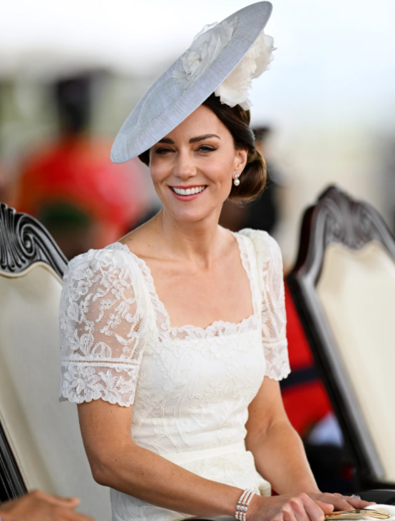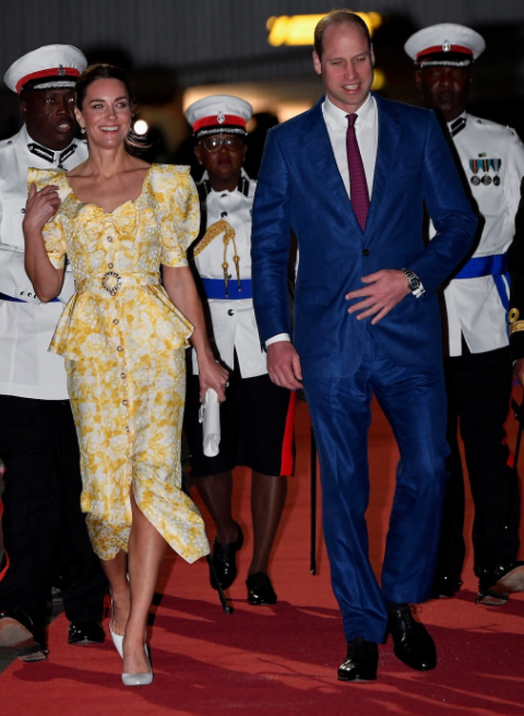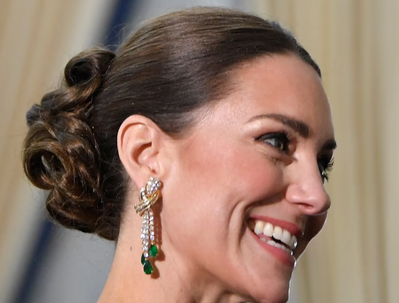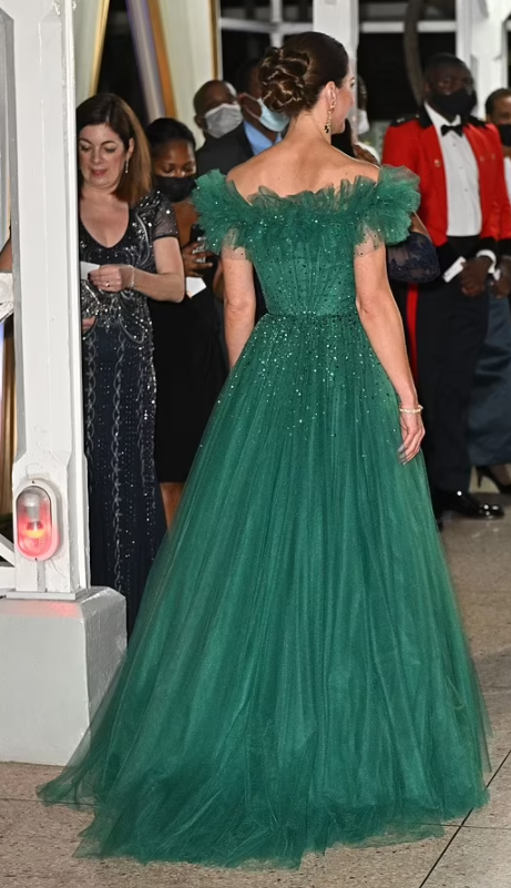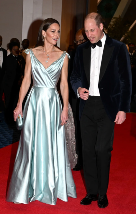 Elizabeth II est bonne prêteuse. Elle met à la disposition de sa très chère Catherine une parure émeraudes et diamants ainsi que la broche colibri. Un bracelet triple rangs évoque le souvenir de Diana. Côté coiffure, la princesse aux cheveux longs opte pour un brushing baguette. L’influenceuse en titre, réserve une surprise de taille à ses admiratrices. Elle introduit des pièces rétro datant des années 50, 60, ainsi qu’une saharienne dessinée par Yves le Magnifique. Pourvu que ça dure ! Le prince William se met au diapason. Il porte plusieurs costumes coupés à Savile Row, dits de diplomatie du vestiaire, dont un sublime smoking en velours saphir à la réception du gouverneur général des Bahamas, Sir Cornelius Smith.