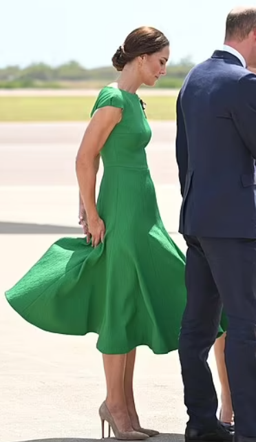 Dès l’ouverture de la porte, le soleil inonde la cabine. Les housses et valises frappées d’un “C” (Catherine) intriguent. Que portera-t-elle ? La tiare sera-t-elle de la partie ? sont autant de questions restant en suspens, jusqu’à ce que Mrs Cambridge dévoile les secrets bien gardés de sa garde-robe. Jenny Packham, Emilia Wickstead, Alexander McQueen, couturiers attitrés aux défilés royaux, donnés aux quatre coins du Commonwealth, sont de la fête. Le vestiaire établit de subtiles correspondances entre le ton des étendards et celui des toilettes. Se présentent sur le tarmac un ensemble bleu, une robe jaune concentrant à elle seule, toute la lumière des tournesols de Van Gogh, une verte en quittant la Jamaïque, une autre déclinaison de bleu vert aux Bahamas et celle des adieux, très inspirée des années 80 époque Dynastie, hissant une dernière fois les couleurs nationales.