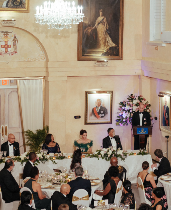Le drapeau jamaïcain comporte trois tonalités dont le noir. La duchesse n’exploite que les plus gaies. Grain de poudre, mousseline, dentelles, crêpe valsent sous une température ambiante de 36°. Heureusement, une pluie rafraichissante s’invite au premier engagement couvert à Nassau. La tête à chapeau ne coiffe qu’une création du modiste Philip Treacy à la parade d’adieu de Kingston. Un grand moment que ce passage en revue à bord d’un Land Rover, écho à la visite de la reine et du prince Philip en 1953. Trois robes grand soir prennent le feu des flashs. L’une dissonante dans un théâtre de pierres Maya, l’autre crinoline de princesse Disney, étoilée des décorations décernées par la reine pour bons et loyaux services rendus à l’institution (Royal Family Order et Grand-Croix de l’Ordre de Victoria) ; l’ultime en satin duchesse bleu glacier-ma préférée-soulignée des bijoux Van Cleef & Arpels.
